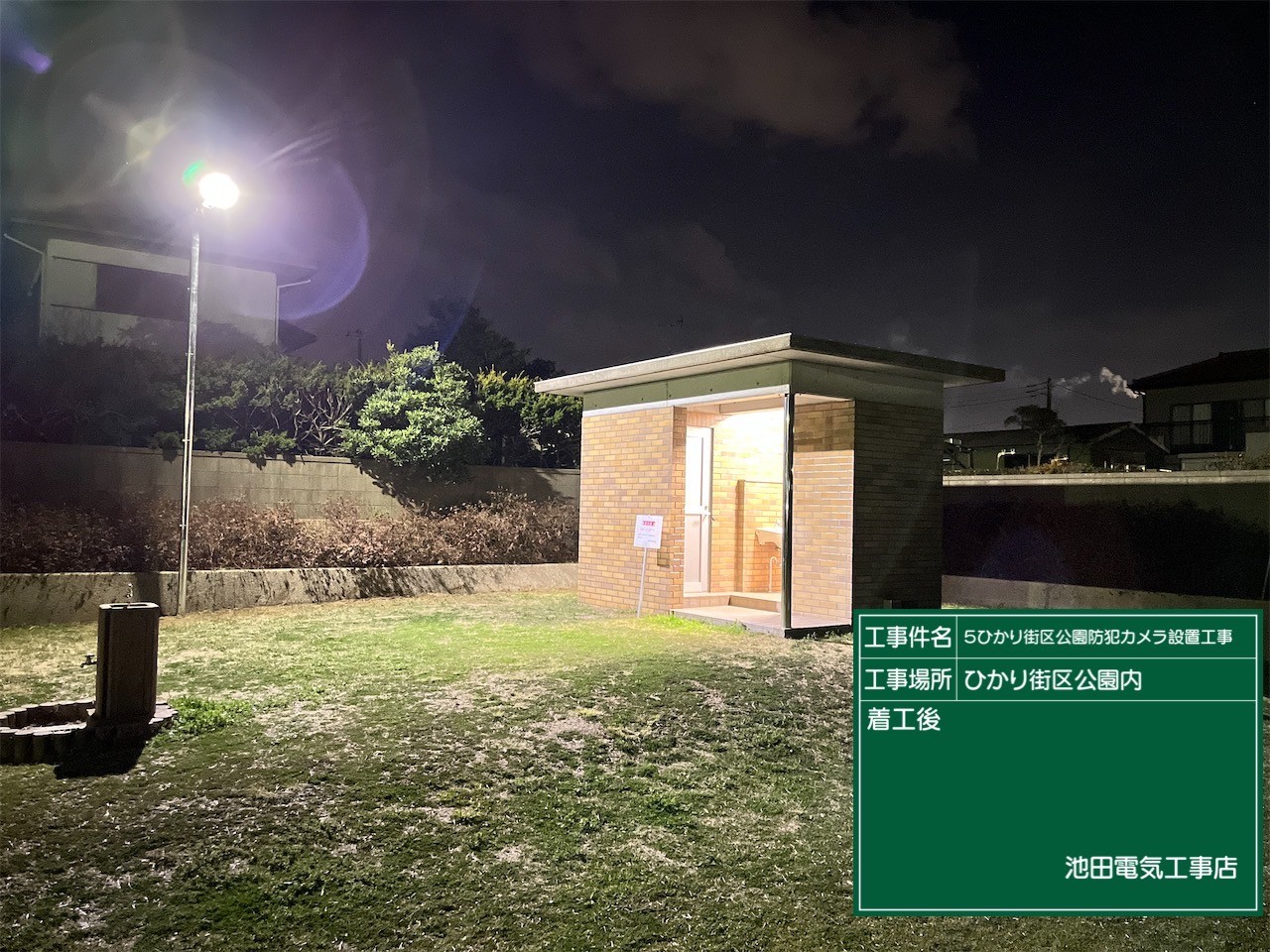 今回は夜間薄暗い公園という事もありトイレの明るさの確保と防犯カメラによる監視を目的として